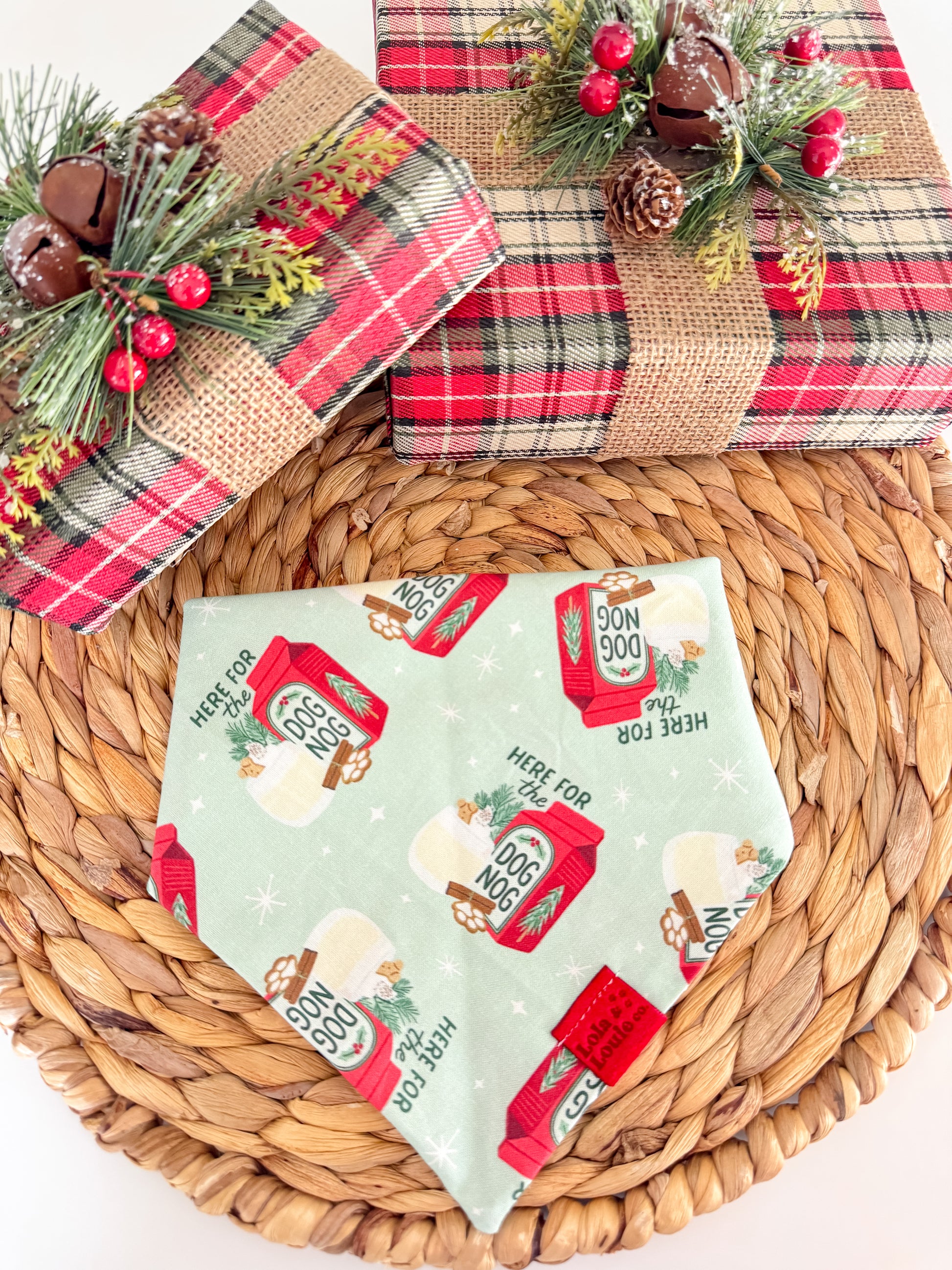Get your pup ready for the holiday season with our Dog Nog bandana! Perfect for festive outings and family photos. Let your furry friend join in on the fun with this quirky accessory. (No actual egg nog included)